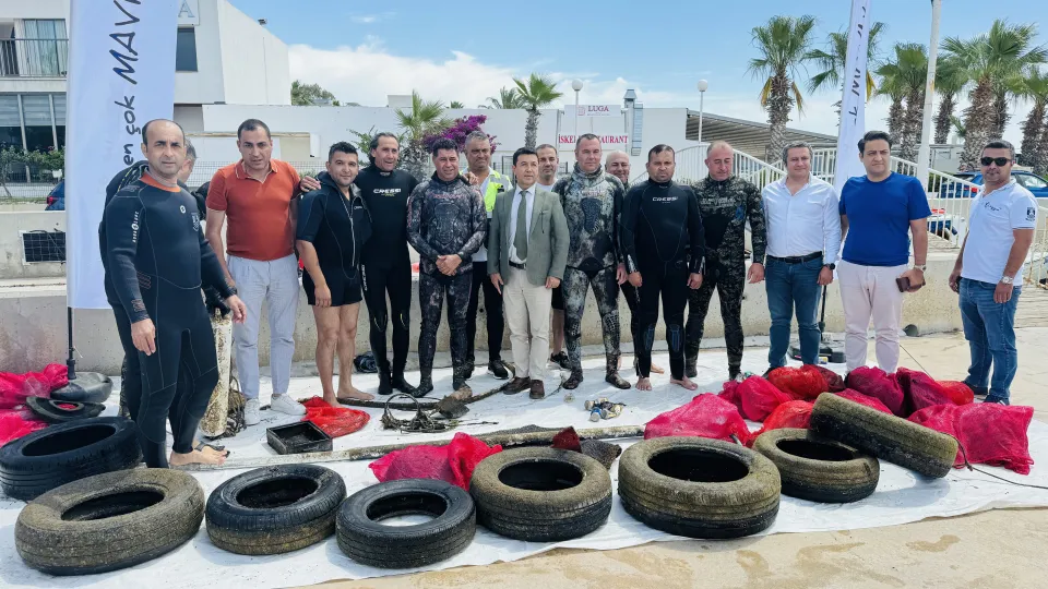 Ortakent Koyu'nda dalgıçların katıldığı etkinlikte deniz dibinden plastik ve cam şişeler, içecek kutuları ve araç lastikleri çıkarıldı.