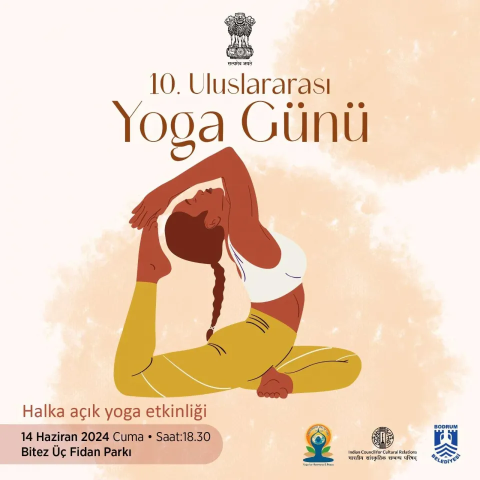 Bodrum Belediyesi Kültür ve Sosyal İşler Müdürlüğü ile Hindistan Başkonsolosluğu organizasyonuyla 10. Uluslararası Yoga Günü etkinliği, 14 Haziran Cuma günü saat 18.30’da Bitez Üç Fidan Parkında yapılacak.
