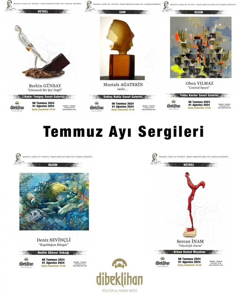 Dibeklihan’da beş solo sergi beş sanatçı ile Temmuz Ayı Sergilerinde Eskişehir Anadolu Üniversitesi Cam Bölüm Başkanı Cam Sanatında Türkiye’deki önemli isimlerden iç dökme serisiyle Prof. Mustafa Ağatekin, Toplumsal içerikli konularıyla figüratif heykeller yapan Berkin Günsay, Düşüncelerini resimlerin içerisinde bir yolculuğa çıkaran eserleriyle Oben Yılmaz, İnsanın kendini keşfetme sürecini deniz temasıyla resimlerine yansıtan ilk solo sergisiyle Deniz Sevinçli ve heykellerinde işitmeyi görselleştirerek insan rollerini konu alan ilk solo sergisiyle Sercan İnam yer alıyor.