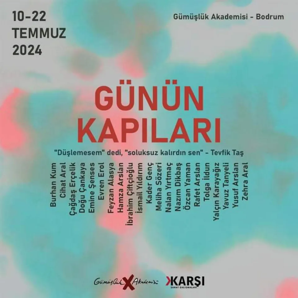 Karşı Sanat ve Gümüşlük Akademisi’nin desteğiyle gerçekleştirilen sergi, adını Tevfik Taş’ın “Günün Kapıları” şiir kitabından alıyor. Sanatçılar; Feyzan Alasya, Cihat Aral, Zehra Aral, Hamza Arslan, Rafet Arslan, Yusuf Arslan, Doğu Çankaya, İbrahim Çiftçioğlu, Nazım Dikbaş, Çağdaş Erçelik, Evren Erol, Tolga İldun, Yalçın Karayağız, Burhan Kum, Meliha Sözeri, Emine Şenses, Yavuz Tanyeli, Özcan Yaman, İsmail Yıldırım ve Nalan Yırtmaç “Günün Kapıları”nda sanatçının düşleriyle var olmak ve var edebilmek adına adımladığı zorlu yollardan, direnç ve umuttan kesitler sunarken kolektif çabayı yüceltiyor.