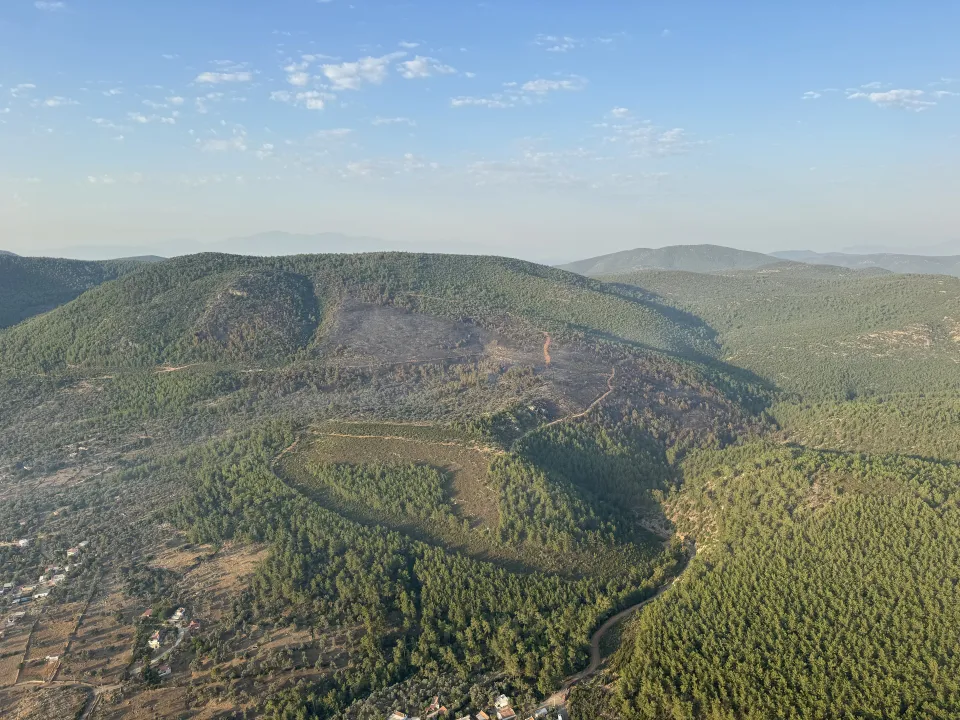 Bodrum ilçesinde önceki gün çıkan orman yangınında alevlerin zarar verdiği alanlar ve ekiplerin yürüttüğü soğutma çalışmaları helikopterle görüntülendi.