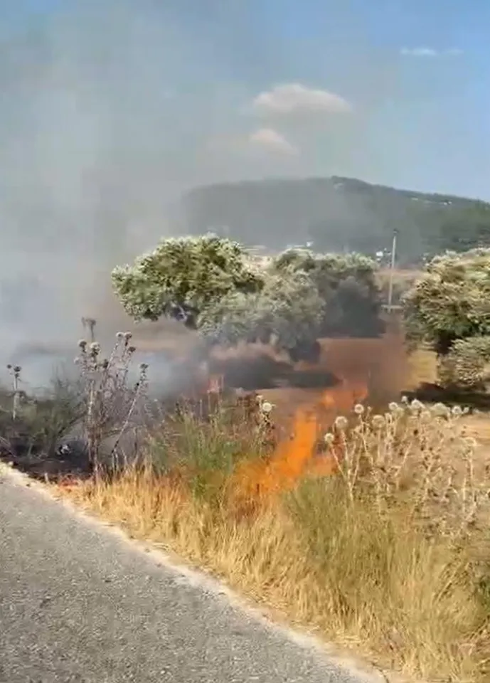 Karayolu kenarında başlayan yangında yol kenarındaki otlar ile zeytinlik alanda bazı zeytin ağaçları alevlerden zarar gördü. Ekiplerin yangını söndürme çalışmaları devam ediyor.