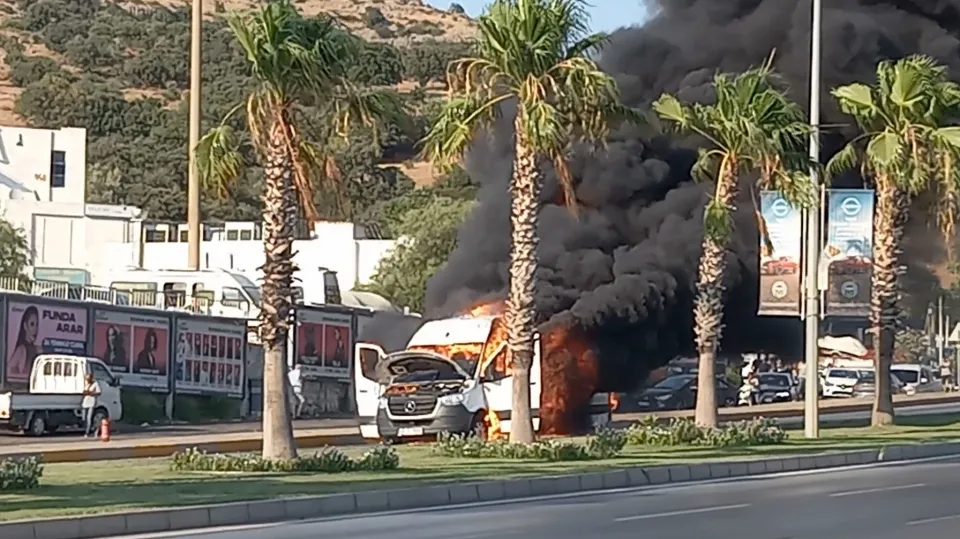 Bodrum ilçesinde seyir halindeki servis minibüsü yanarak kullanılamaz hale geldi.
