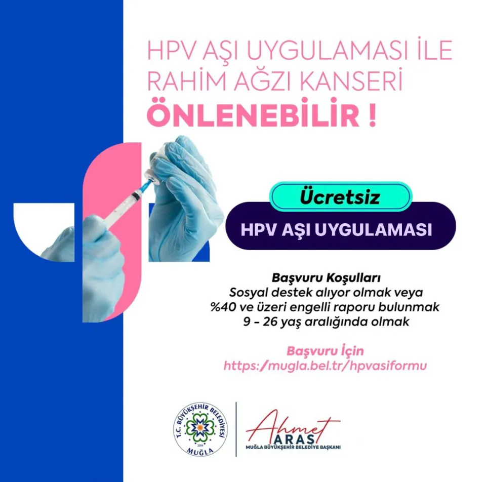 HPV Aşısı ilk etapta Muğla il sınırları içinde ikamet eden, Büyükşehir Belediyesi’nden sosyal yardım alan veya yüzde 40 üzeri engelli raporu bulunan 9-26 yaş aralığındaki kız çocuklarına ve kadınlara ücretsiz yapılacak. Aşı için başvurular 31 Temmuz tarihine kadar https://mugla.bel.tr/hpvasiformu adresinden yapılabilecek.