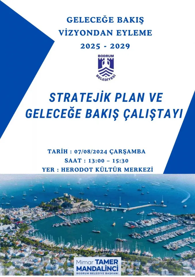 Bodrum Belediyesinin “Geleceğe Bakış Vizyondan Eyleme” başlığıyla 2025 ile 2029 dönemlerine ait stratejik plan oluşturma çalışmaları tüm hızıyla devam ediyor. Bu kapsamda ortak akıl, katılımcılık ve şeffaflık prensipleri çerçevesinde Bodrum Belediyesi tüm iç ve dış paydaşlarla konuyu ele almaya başlıyor.