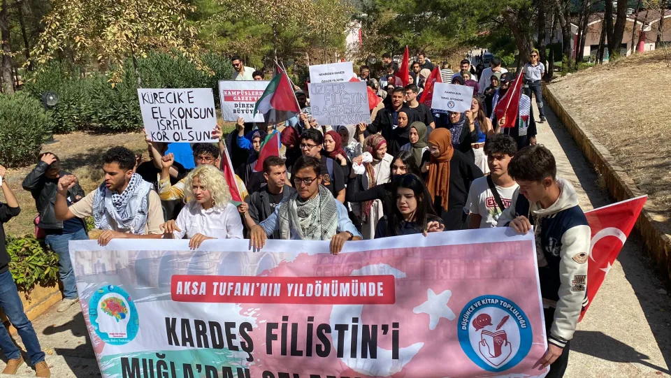 Üniversitedeki Öğrenci Sarayı önünde toplanan öğrenciler kampüs içerisinde "Aksa Tufanı'ın Yıl Dönümünde Kardeş Filistin'i Muğla'dan Selamlıyoruz" yazılı pankart eşliğinde yürüyüş başlattı. Kampüste gerçekleşen yürüyüş boyunca "Kahrolsun ABD, Kahrolsun İsrail", "Kahrolsun Amerikan Emperyalizmi!" ve "Kampüslerden Gazzeye Direniş Büyüyor" sloganları atıldı.