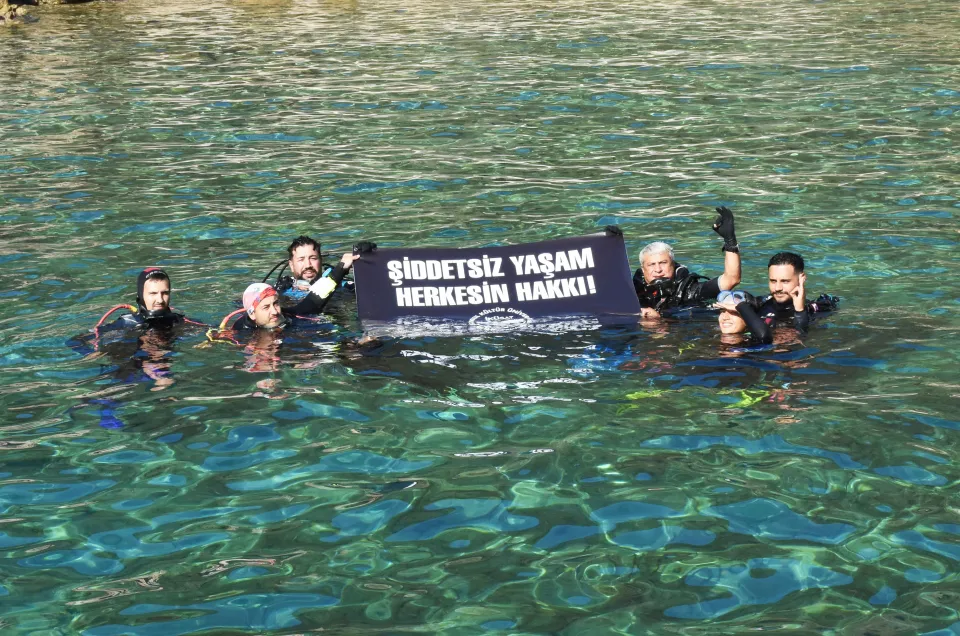 Rehber dalıcıların da yer aldığı etkinlikte, Dakota C47 uçak batığı ve farklı noktada "Şiddetin her türlüsüne karşı bir aradayız" ve "Şiddetsiz yaşam herkesin hakkı" yazılı pankart açıldı. Öğrencilerin etkinliği AA muhabirince de görüntülendi.