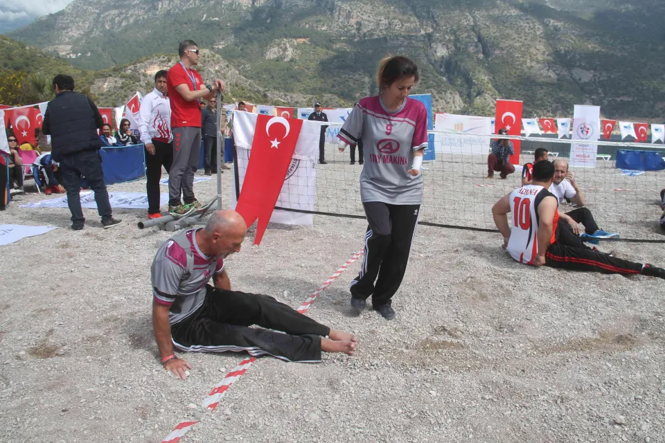 Fethiye'nin dünyaca ünlü Ölüdeniz Kumburnu Plajı'nda buluşan engelli sporcular, oturarak plaj voleybolu oynayarak Türkiye'de bir ilke imza attı.