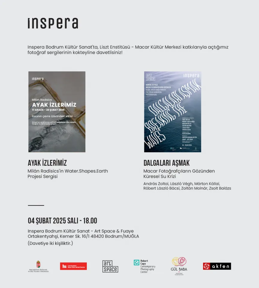 2024’te Bodrum Ortakent’te açılan yeni kültür sanat alanı INSPERA BODRUM KÜLTÜR SANAT, yıl boyunca yeme içme alanları, sanat akademisi, sergiler, söyleşiler ve konserler ile Bodrum’da ulusal ve uluslararası nitelikli etkinliklere imza atmaya devam ediyor. Ocak ve Subat aylarinda INSPERA FUAYE sergi salonu ünlü Macar fotoğrafçı Milan Radisics’i ağırlarken, INSPERA ART SPACE’de ise Macar fotoğrafçıların eserlerinden oluşan “Dalgaları Aşmak” sergisi yer alıyor.