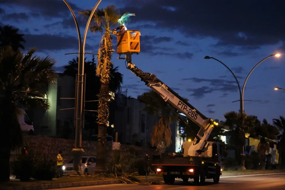 Bodrum Belediyesi Park ve Bahçeler Müdürlüğü, şehrin yeşil dokusunu korumak ve estetik görünümünü artırmak amacıyla palmiye ağaçlarında budama çalışması yapıyor.