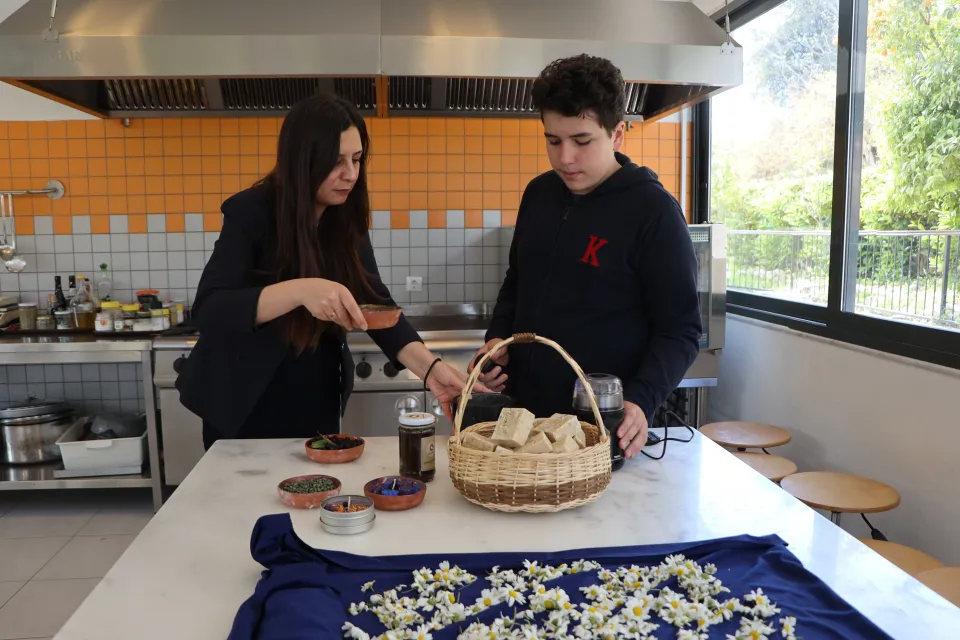 Yakaköy Mahallesi'ndeki özel bir kolejde öğrenim gören 13 yaşındaki Emre Erken, danışman öğretmeni Derya Yıldırım'ın desteğiyle okulun bahçesinden topladığı defne tohumlarını işleyerek laboratuvar ortamında doğal sabun elde etti.
