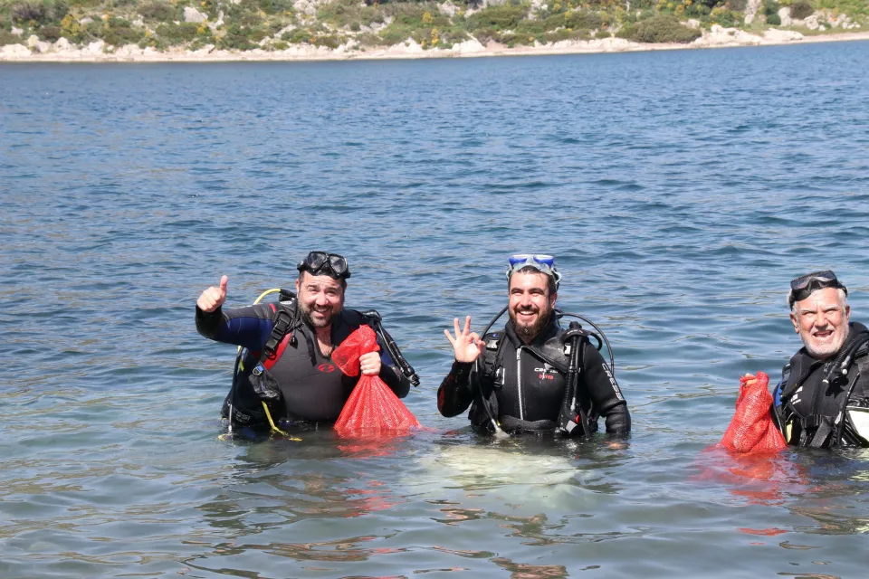 “Deniz en çok mavi yakışır” sloganıyla iki yıldır devam eden deniz dibi temizlik kampanyasının bu haftaki temizliği Gümüşlük’teydi. Bodrum Belediyesi dalış ekibinde görevli dalgıçlar ile birlikte denize dalarak temizliğe yardım eden Ata Demirer ile Aksona Mehmet ve oğlu Fatih Baş denizde yaklaşık kırk beş dakika kalarak topladıkları çöpü yetkililere teslim etti.