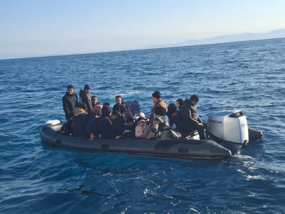 Ekipler tarafından durdurulan fiber karinalı lastik botta, 11'i çocuk 26 düzensiz göçmen yakalandı.