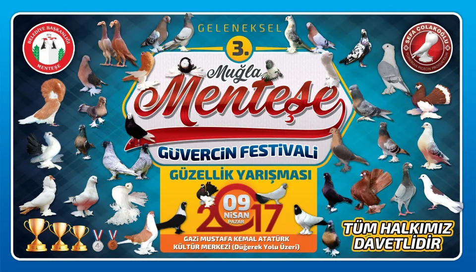 Menteşe Belediyesi ve Muğla Güvercin Sevenler Birliği tarafından düzenlenen Geleneksel Menteşe Güvercin Festivali 09 Nisan 2017 Pazar Günü Gazi Mustafa Kemal Atatürk Kültür Merkezi’nde başlıyor. Bu yıl üçüncüsü gerçekleşecek olan festivalde, ırk özelliklerini taşıyan en bakımlı ve güzel güvercinler değerlendirilerek yarışacak.
