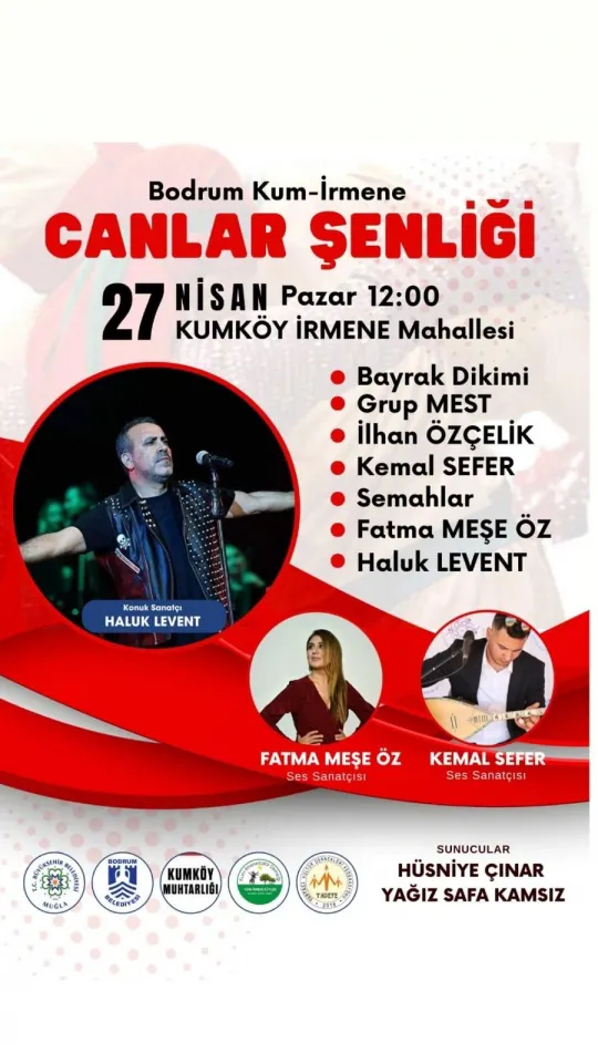 Muğla Büyükşehir Belediyesi, Bodrum Belediyesi, İrmene Muhtarlığı, Kum-İrmene Cemevi Derneği, Tahtacı Kültür Dernekleri Federasyonu (TADEFE) tarafından desteklenen Bodrum Kum-İrmene Canlar Şenliği 27 Nisan Pazar günü saat 12:00’de başlayacak. Hüsniye Çınar ile Yağız Sefa Kamsız’ın sunuculuğunu yapacağı şenlikte Grup Mest, İlhan Özçelik, Kemal Sefer, Fatma Meşe Öz ve Haluk Levent sahne alacak ve Bodrum Semah ekibi semah gösterisi yapacak.