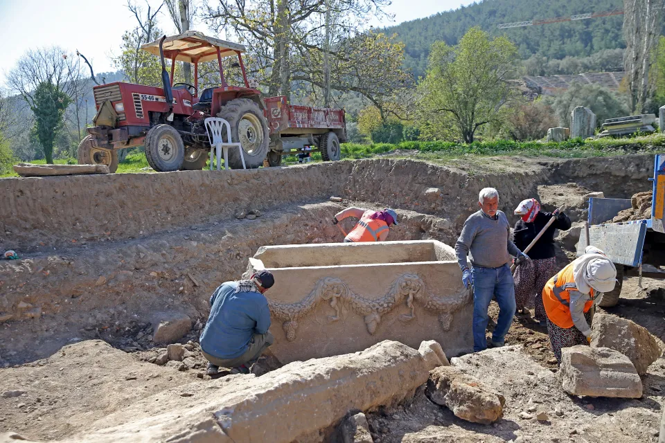 Yatağan ilçesindeki Stratonikeia Antik Kenti'nde yürütülen kazı çalışmalarında 2 bin yıl öncesine ait girlandlı lahit gün yüzüne çıkarıldı.