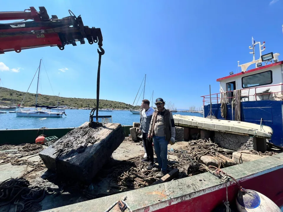 Bodrum ilçesinde denizdeki tonozlar ve atıklar, dalgıçlar eşliğinde vinçle çıkarıldı.