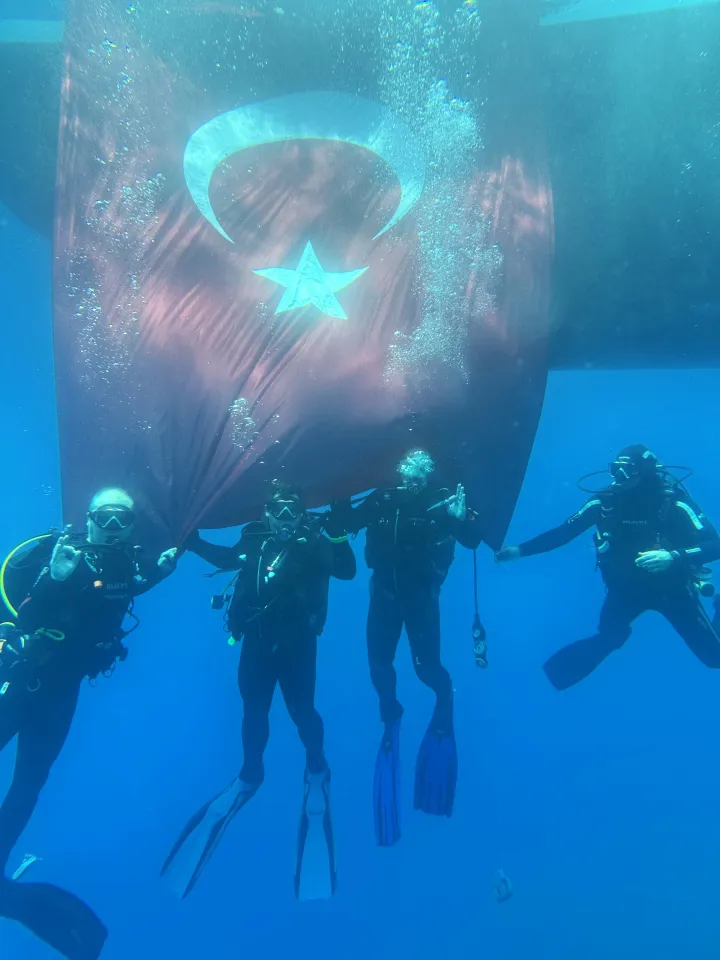 Etkinliğe katılanlar, bir ucu teknede bağlı Türk bayrağını su altında açarak, bir süre önünde yüzdü, fotoğraf çektirdi.