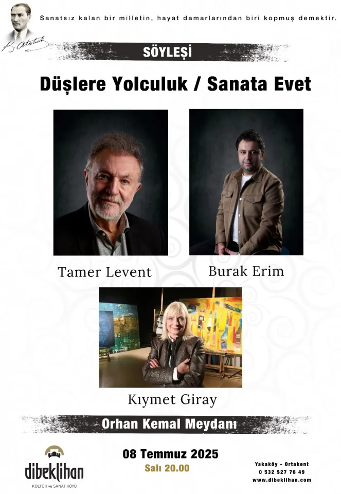 “Düşlere Yolculuk / Sanata Evet” başlıklı söyleşi, 08 Temmuz Salı günü saat 20.00’de Dibeklihan Kültür ve Sanat Köyü’nde Orhan Kemal Meydanı'nda gerçekleşecek. Söyleşide Sanatçı Burak Erim ve Tamer Levent’e, serginin küratörlüğünü de üstlenen değerli sanat tarihçisi Prof. Dr. Kıymet Giray eşlik edecek. Söyleşi, sanatın belleği nasıl dönüştürdüğüne ve sanatsal üretimin bireysel ve toplumsal iyileşmeye katkısına dair önemli bir sohbet alanı sunacak.