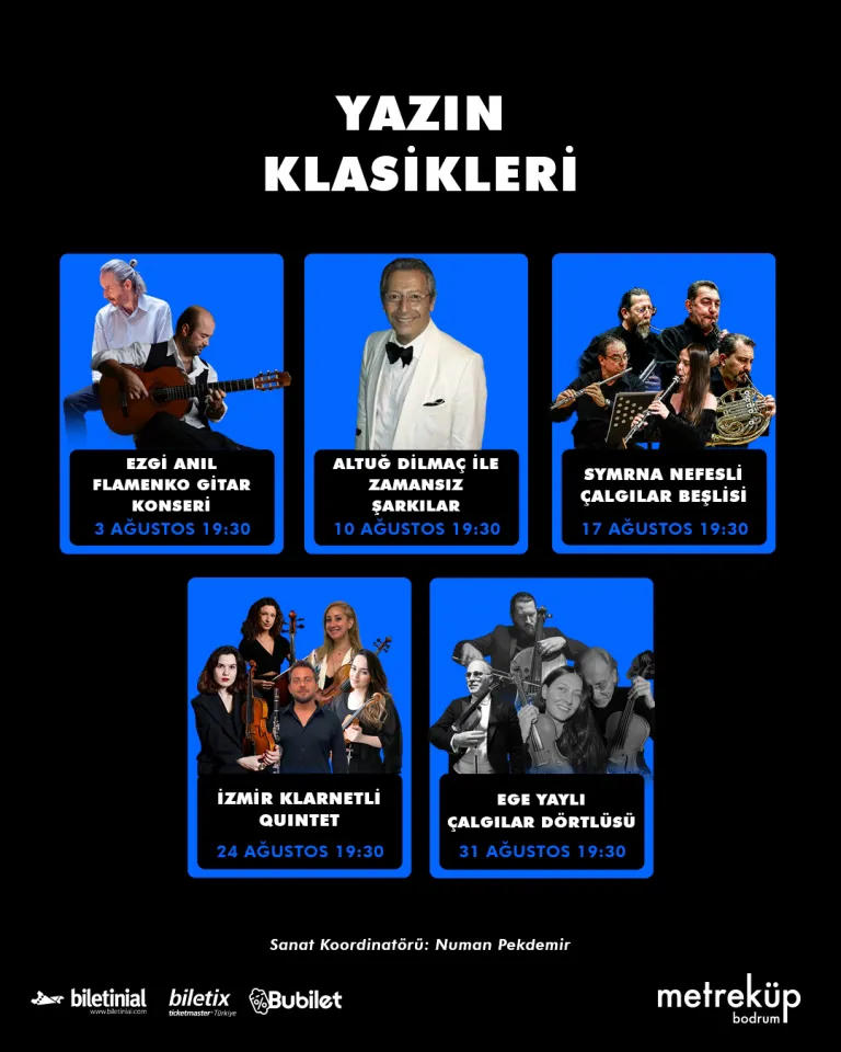 Numan Pekdemir’in sanat koordinatörlüğünde gerçekleşen klasik müzik akşamlarında, her hafta farklı bir topluluk ya da sanatçı sahne alarak müziğin zarafetini Bodrum’la buluşturuyor.