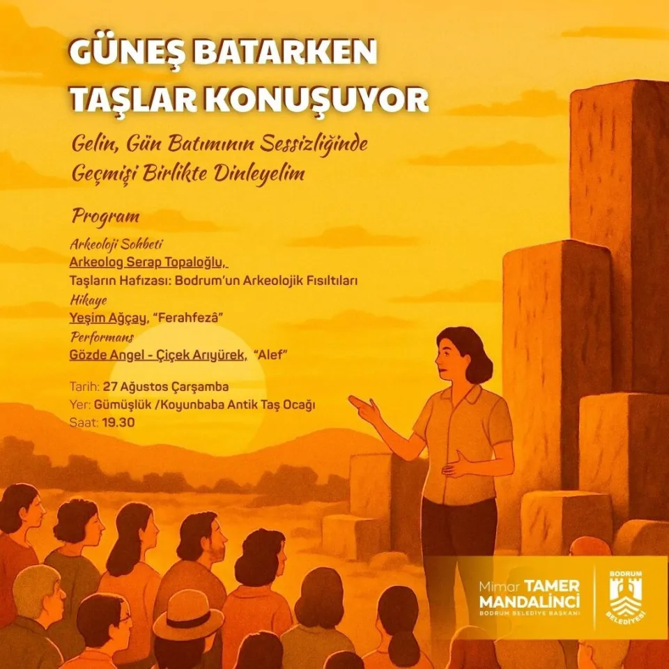 Bodrum’da bir ilk olan etkinlikte, Bodrum Belediyesi personeli Arkeolog Serap Topaloğlu, “Taşların Hafızası: Bodrum’un Arkeolojik Fısıltıları” başlıklı söyleşisiyle katılımcıları Bodrum’un arkeolojik geçmişine dair interaktif bir sohbetle buluşturacak. Ardından, Yeşim Ağçay, “Ferahfezâ” adlı hikâyesiyle dinleyicileri zamanda bir yolculuğa çıkaracak. Gecenin sonunda ise Gözde Angel ve Çiçek Arıyürek “Alef” adlı dans performanslarıyla taşların arasında sanat dolu bir atmosfer yaratacak.