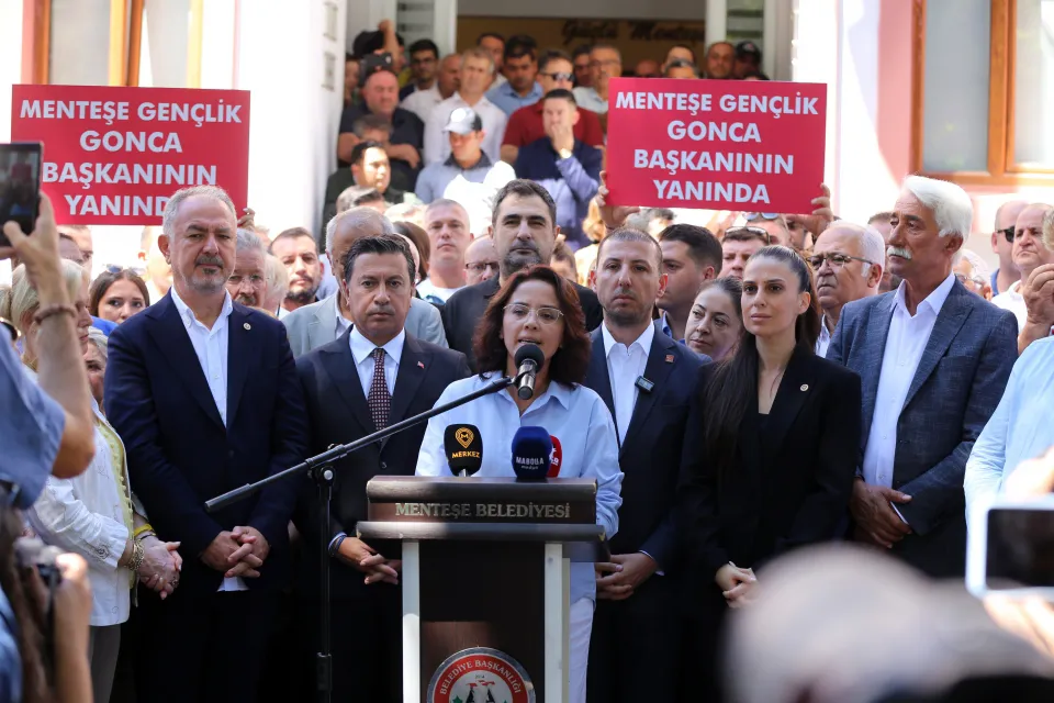 Bu arada, belediye binası önünde toplanan bir grup, ellerinde "Menteşe gençlik Gonca başkanın yanında" yazılı döviz taşıdı. Gösteriye, CHP Muğla milletvekilleri Cumhur Uzun, Gizem Özcan, CHP İl Başkanı Zekican Balcı, Büyükşehir Belediye Başkanı Ahmet Aras, ilçe belediye başkanları, eski milletvekilleri, partililer ve vatandaşlar katıldı.