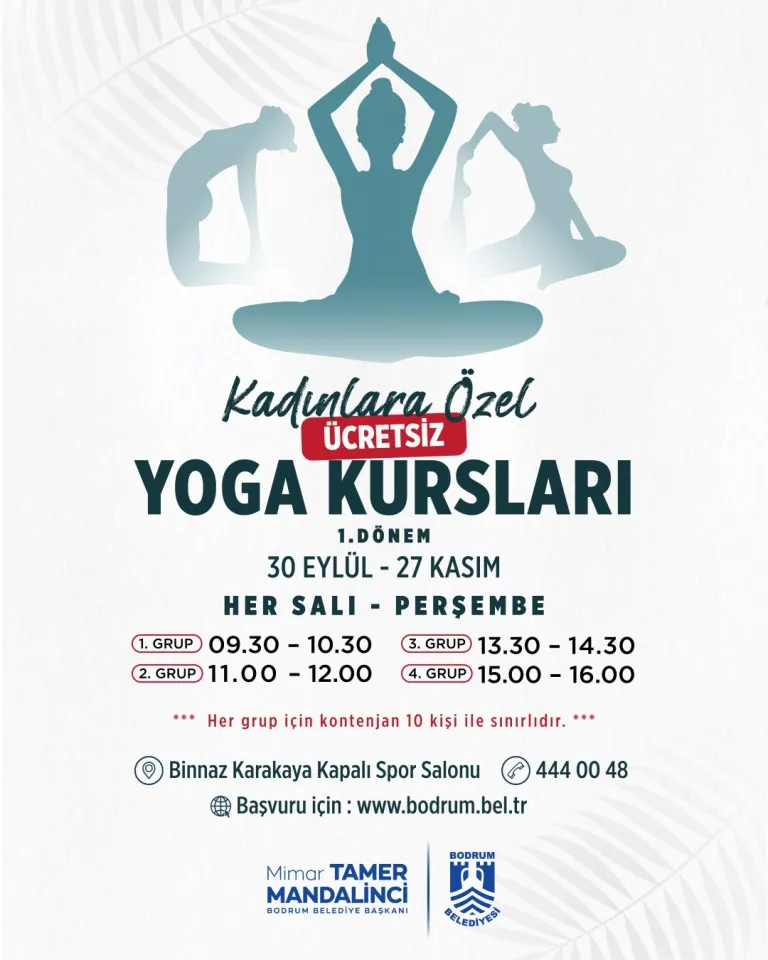 Bodrum Belediyesi Kültür ve Sosyal İşler Müdürlüğü tarafından “Kendinle Buluş, Nefes Al, Güçlen!” sloganıyla hayata geçirilen kursların birinci dönemi 30 Eylül ile 27 Kasım tarihleri arasında düzenlenecek. Salı ve perşembe günleri yapılacak olan kurslar, alanında uzman eğitmenler eşliğinde dört farklı grup halinde gerçekleştirilecek. Her biri 10 kişilik gruplardan oluşan, iki aylık periyotlarla düzenlenen ve her dönem yeni katılımcılara açık olan yoga kursları, ücretsiz olarak verilecek ve kontenjanla sınırlı olacak.