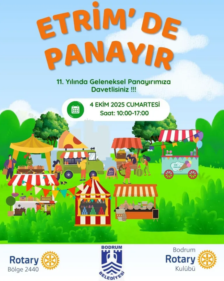 Bodrum Rotary Kulübü tarafından bu yıl 11’incisi düzenlenecek Geleneksel Etrim Köy Panayırı, 4 Ekim Cumartesi günü 10.00 – 17.00 saatleri arasında gerçekleştirilecek. “Toprağını satma, ürününü sat” sloganıyla düzenlenen etkinlik, yerel üreticileri desteklemeyi ve kültürel mirasın korunmasını hedefliyor…