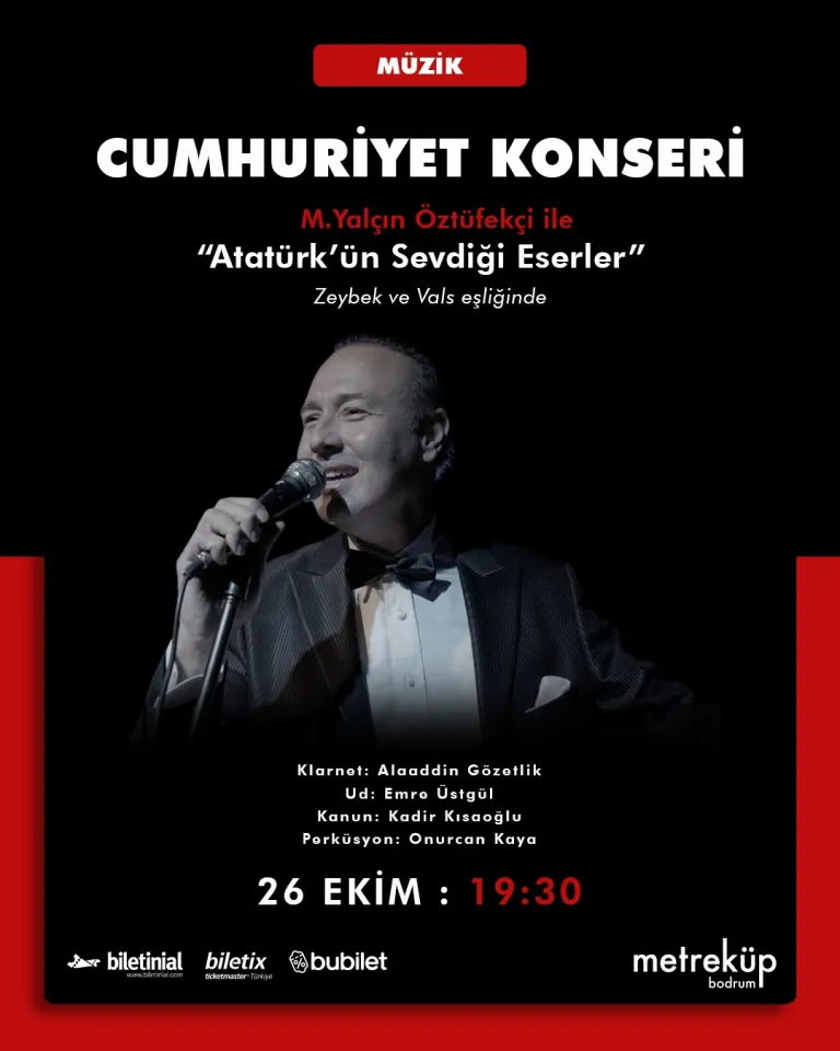 M. Yalçın Öztüfekçi ve Türk Sanat Müziği Orkestrası’nın sahne alacağı bu özel gecede, Atatürk’ün sevdiği eserler, zeybek ve vals gösterileriyle taçlanacak.