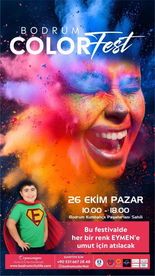 Bodrum, DMD kas hastası Eymen Özdoğan’a umut olmak için renklerle buluşuyor. 26 Ekim Pazar günü Kumbahçe Paşatarlası’nda gerçekleşecek Bodrum Color Fest’te “Her bir renk Eymen’e umut olmak için atılacak” sloganıyla Tüm Bodrum’un etkinliğe destek vermesi bekleniyor.