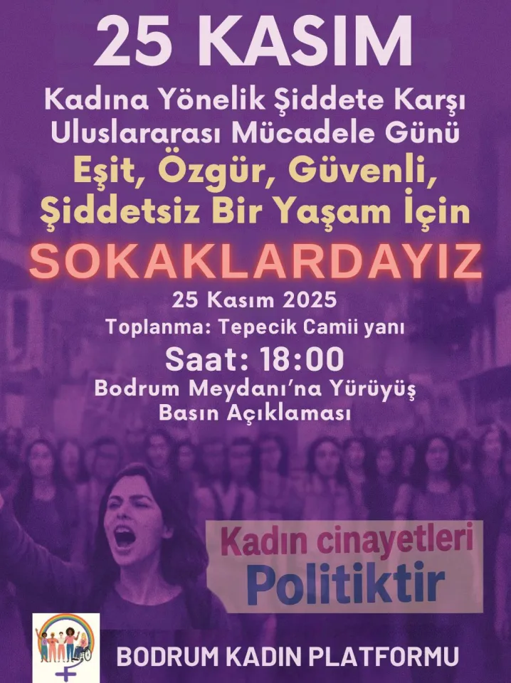 Bodrum’daki tüm kadınları ve LGBTİ+’ları, 25 Kasım’da itirazımızı birlikte haykırmaya çağırıyoruz.”