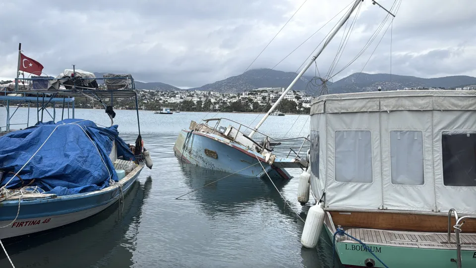 Bodrum ilçesinde bir tekne, kuvvetli rüzgar nedeniyle su alıp yan yattı.