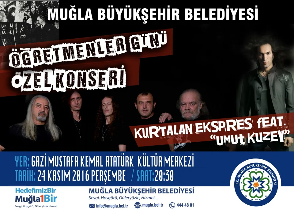 En köklü gruplardan olan Kurtalan Ekspres 24 Kasım Öğretmenler Günü kutlamaları için 24 Kasım Perşembe günü Muğla’da sahne alacak. Grup Menteşe Gazi Mustafa Kemal Atatürk Kültür Merkezi’nde saat 20.30’da sahneye çıkacak.