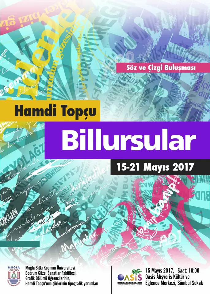 Muğla Sıtkı Koçman Üniversitesi Güzel Sanatlar Fakültesi Grafik Bölümü öğrencileri, Hamdi Topçu'nun şiirlerinden yola çıkarak tipografik eserler üretti. Oasis Kültür ve Alışveriş Merkezi Sümbül Sokak’ta sergilenecek olan eserler 15 Mayıs Pazartesi günü saat 18.00’de gerçekleştirilecek olan açılışla sanatseverlerle buluşacak. Oasis sponsorluğunda, ÇYDD yararına gerçekleştirilecek olan sergi, 21 Mayıs'a kadar devam edecek.