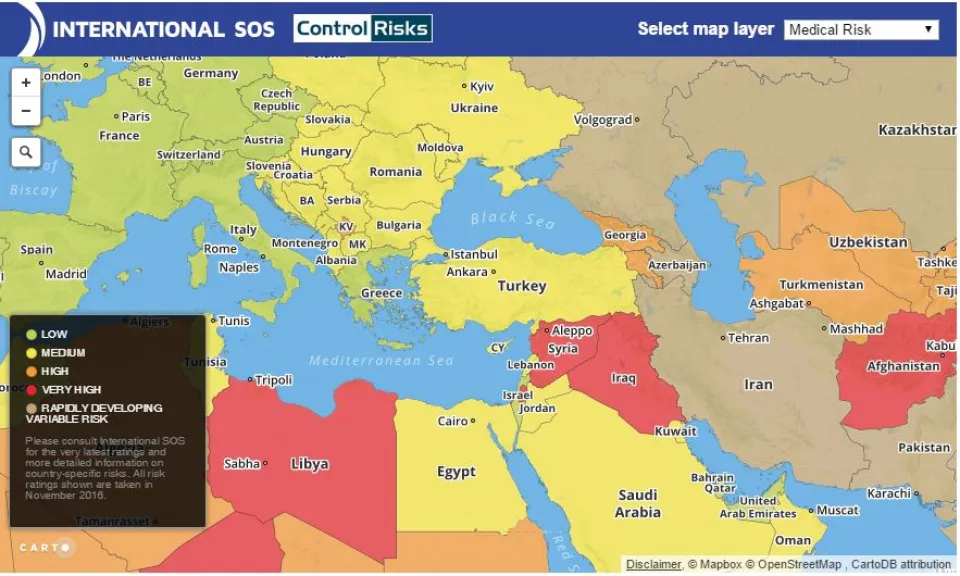 Dünyanın seyahat riski haritası açıklandı. Haritaya göre Türkiye orta risk seviyesine sahip. Türkiye’nin sınır komşuları Gürcistan ve Azerbaycan yüksek risk grubundaki ülkeler arasında yer alırken Suriye, Irak, Afganistan, Libya ise çok yüksek riskli bölge olarak görülüyor. Yunanistan, İtalya, Çek Cumhuriyeti, Avusturya, Fransa, İspanya, Almanya gibi Avrupa ülkeleri düşük riskli ülkelerken; Bulgaristan, Romanya, Sırbistan Türkiye gibi orta seciyeli risk barındıran ülkeler arasında yer alıyor. İran, Kazakistan, Özbekistan ve Rusya ise hızla artan, değişken risk grubundaki ülkeler olarak görülüyor.