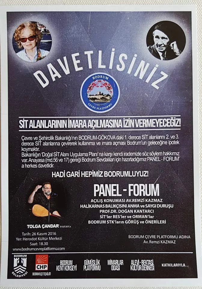 Bodrum Çevre Platformu, Bodrum’un gübdemşndeki en önemli konulardan biri olan yeni SİT yasasını masaya yatıracak. 26 Kasım Cumartesi günü saat 18.30’da Tolga Çandar’ın da katılımıyla Heredot Kültür Merkezi’nde gerçekleşecek olan etkinliğe; Bodrum Belediyesi, CHP Bodrum İlçe Teşkilatı,Bodrum Kent Konseyi, Gümüşlük Platformu, Mimarlar Odası ve Alevi-Bektaşi Kültür Derneği katkı veriyor.