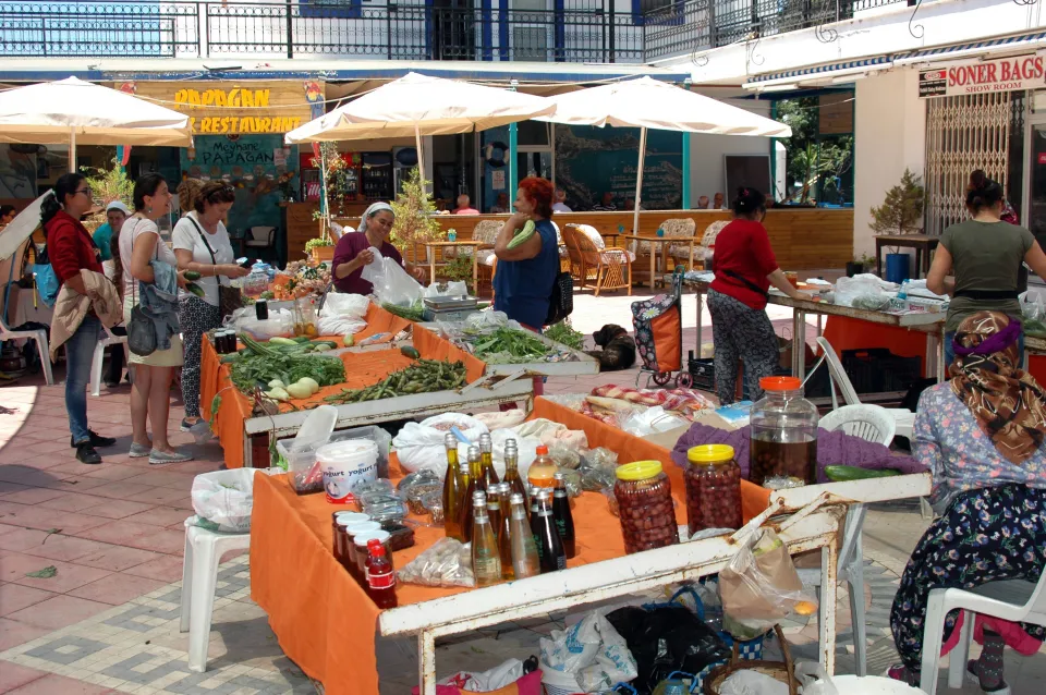Bodrum Yerel Üretici Pazarı'nda, sebze ve meyvelerin yanı sıra yine içeriği doğal tarım yöntemi ile üretilen ürünlerden elde edilen çeşitli gıdalarla yer alıyor.