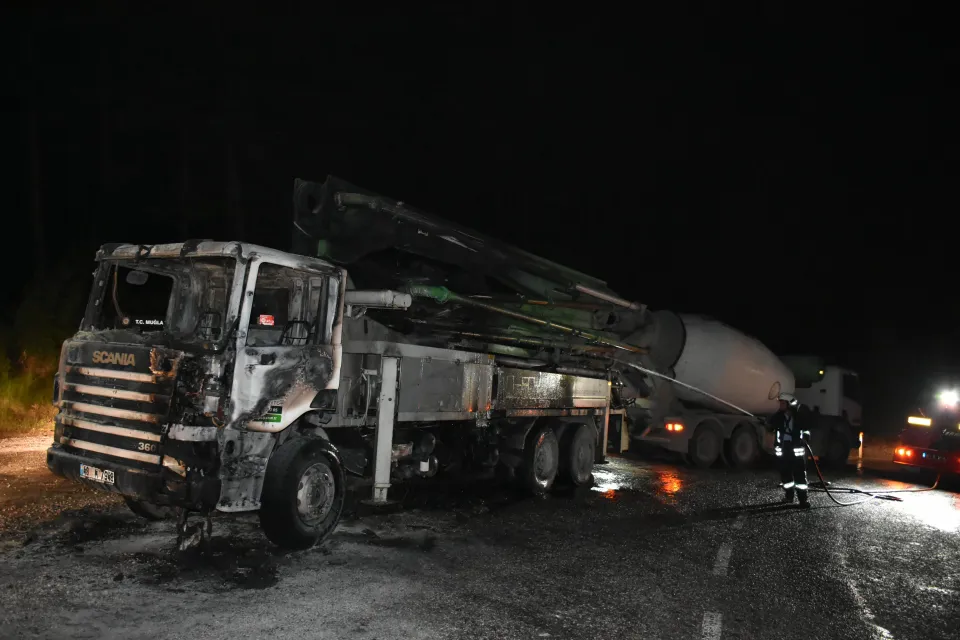 Alınan bilgiye göre, olay akşam saat:22.30 sıralarında Marmaris İlçesi’ne bağlı 20 kilometre mesafedeki Karacasöğüt Mahallesi Bayır Sokağı çıkışında meydana geldi. İddiaya göre, Okluk Koyu’nda bulunan Cumhurbaşkanlığı konutunda çimento aktaran beton pompasını taşıyan kamyon işini bitirdikten sonra yola çıktı. Taner Deveci’nin kullandığı 48 M 7948 plakalı beton pompası kamyonu bir anda arka kısmından alevler yükselmeye başladı. Aracı durduran Deveci, yangın söndürme tüpleriyle ilk müdahaleyi yaparak itfaiye ve jandarmayı aradı. Olay yerine genel jandarma ekipleri yolu trafiğe kapatarak çevre güvenliği aldı. Muğla Büyükşehir Belediyesi’ne bağlı bir itfaiye ve Marmaris Orman İşletme Müdürlüğü’ne bağlı iki arazöz, yangını ormana sıçramadan söndürdü. Soğutma çalışması sonrası beton pompası taşıyan kamyon kullanılamaz hale geldi. Marmaris İlçe Jandarma ekipleri yangın ile ilgili soruşturma başlattı. (İHA)