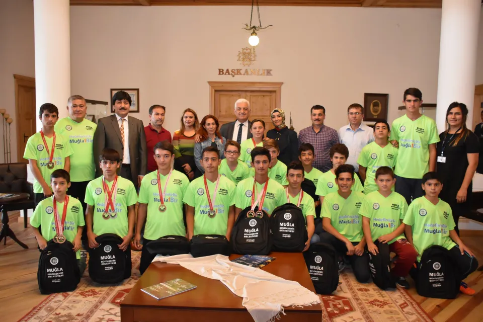 Muğla Büyükşehir Belediyesi’nin 16 madalyalı genç güreşçileri; Muğla Büyükşehir Belediyesi Turizm Gençlik ve Spor Dairesi Başkan V. Ali İnan, antrenör Yüksel Topçu ve aileleri ile birlikte Belediye Başkanı Dr. Osman Gürün’ü ziyaret etti. Genç sporcuların aileleri, çocuklarına sağlanan imkânlar ve destekler için Muğla Büyükşehir Belediye Başkanı Dr. Osman Gürün’e teşekkür etti.