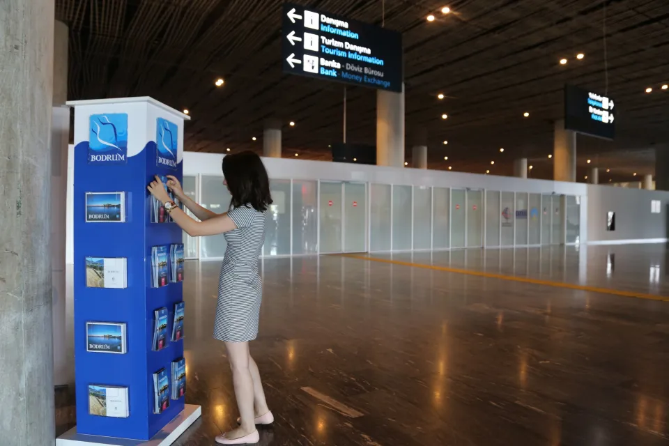 milas-Bodrum Havalimanı’ndan giriş yapan ziyaretçilere Bodrum’u daha iyi tanıtmak için hazırlanan broşürlerin bulunduğu deskler yoğun ilgi görüyor.