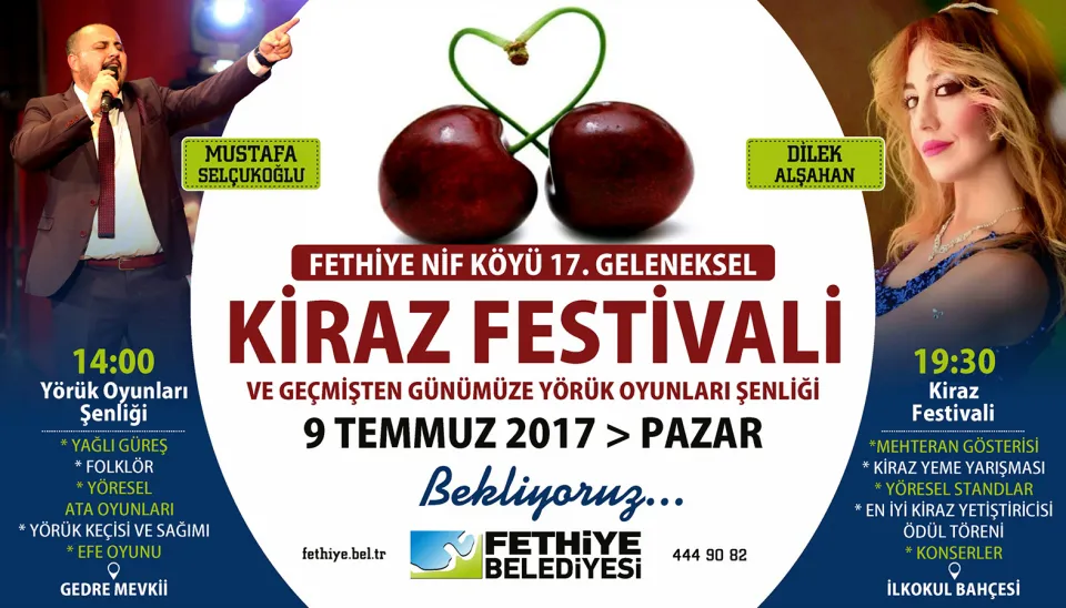 FETHİYE Belediyesi tarafından bu yıl 17’ncisi düzenlenecek olan Nif Kiraz Festivali yine dolu dolu geçecek. Pazar günü saat 14.00 da Gedre Mevkii’nde yörük oyunları şenliği ile başlayacak olan etkinlikler, saat: 19.30 da Nif İlköğretim Okulu bahçesinde sanatçı Mustafa Selçukoğlu ve Dilek Alşahan’ın vereceği konserler ile devam edecek.
