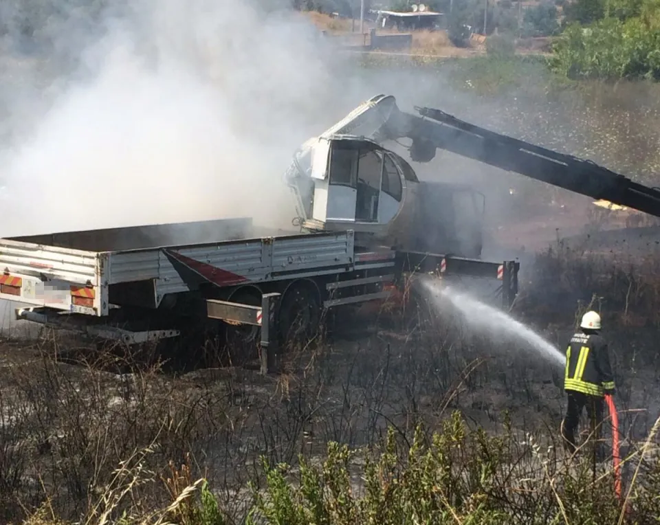 Milas ilçesinde arazide çalışma yapan bir vinç aniden alev aldı. Yanan vinçten çıkan alevler çalışma yapılan araziye de sıçradı.