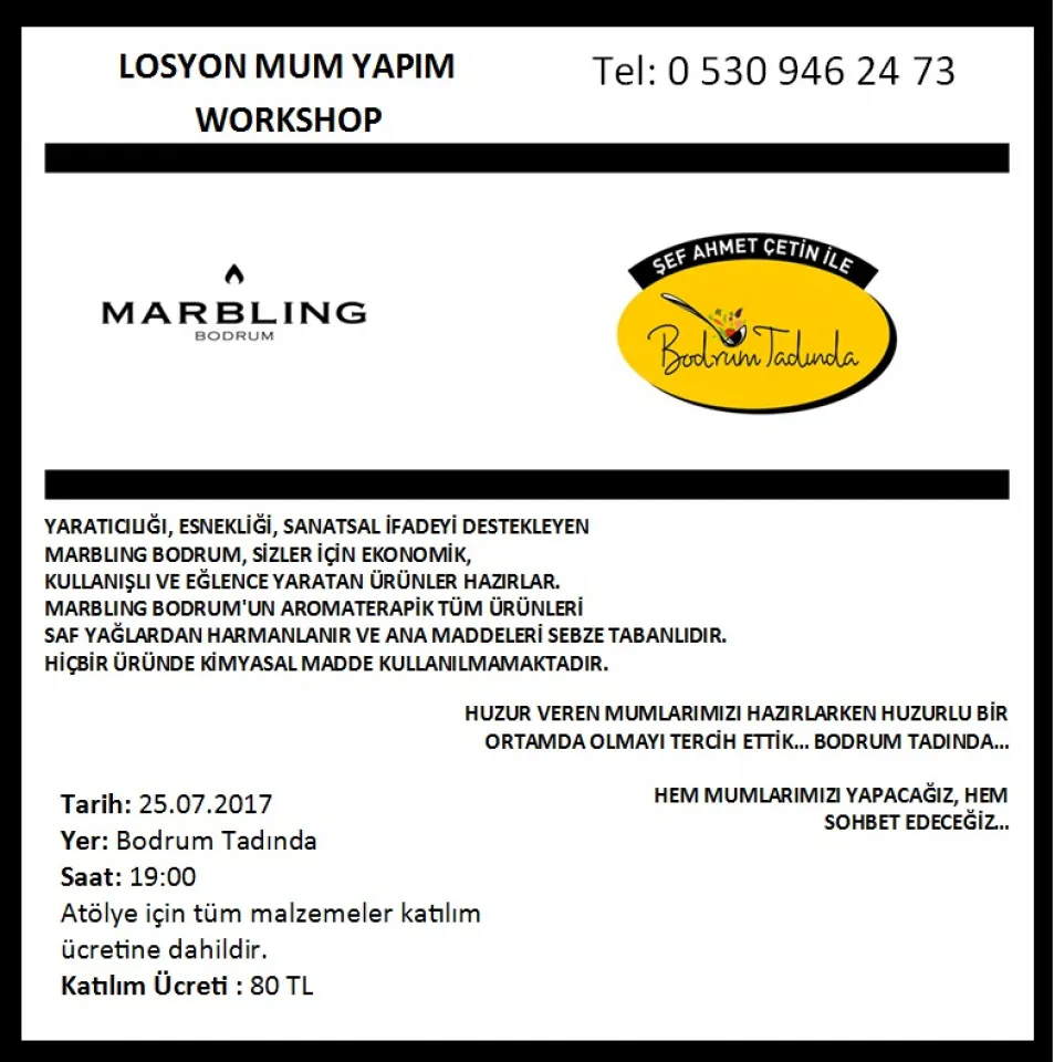 25 Temmuz günü saat: 19.00’da Bodrum Tadında’da düzenlenecek olan workshop atölye malzemeleri dahil olmak üzere isteyen herkes katılabilecek.