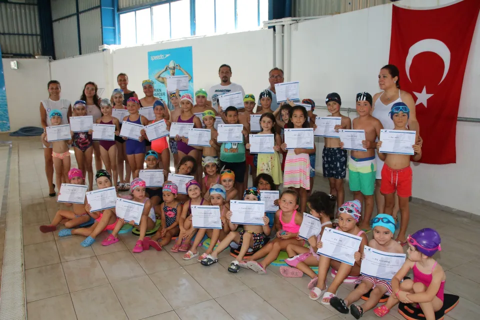 Bodrum Belediye A.Ş. Müdürü Hüseyin Yıldızhan, Bodrum Belediyesi Binnaz Karakaya Spor Tesisleri'ndeki törende minik yüzücülere sertifikalarını verirken Aysu Türkoğlu da başarılarından dolayı plaket ve madalya verdi.