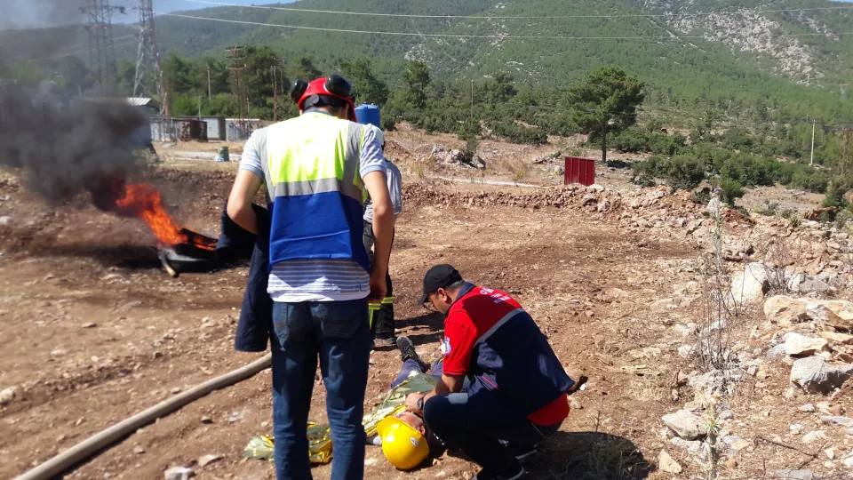 Maden Direktörlüğü açık ocak işletmeleri büyük ölçüde ormanla sınır olduğu için ilk tatbikat senaryosu, Yatağan Orman İşletme Bağyaka Şefliğiyle işbirliği yapılarak, Tınaz açık ocak işletmesinin trafo ve elektro-mekanik bölümünün bulunduğu noktada hayata geçirildi. Senaryo gereği alınan yangın ihbarı üzerine, Orman ve Maden İşletme yangın söndürme araçları olay yerine gönderildi. Olayda bir çalışan yaralandı. Yaralıya, ilkyardım ekibi ilk müdahaleyi yaptı ve yaralı güvenli bir bölgeye taşındı. Yangın söndürme ekipleri, ortaklaşa yangını denetim altına aldı, ormanlık alan ile trafoya sıçramasını önledi. Yaralı sedye ile ambulansa taşınarak Yatağan Devlet Hastanesine ulaştırıldı. Tatbikat 25 dakika sürdü.