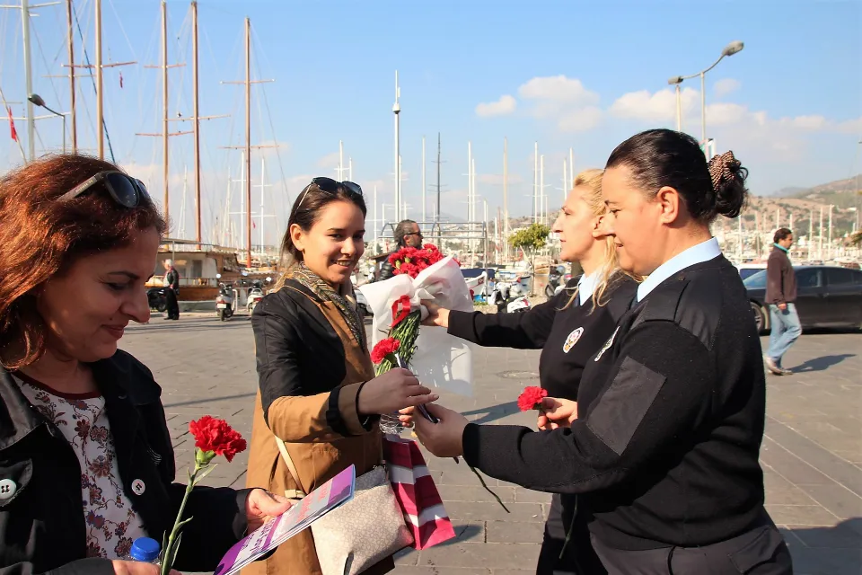 25 Kasım Kadına Yönelik Şiddetle Mücadele Gününde Bodrum’da kadın polisler kadınlara karanfil ve kanun kitapçığı dağıttı.