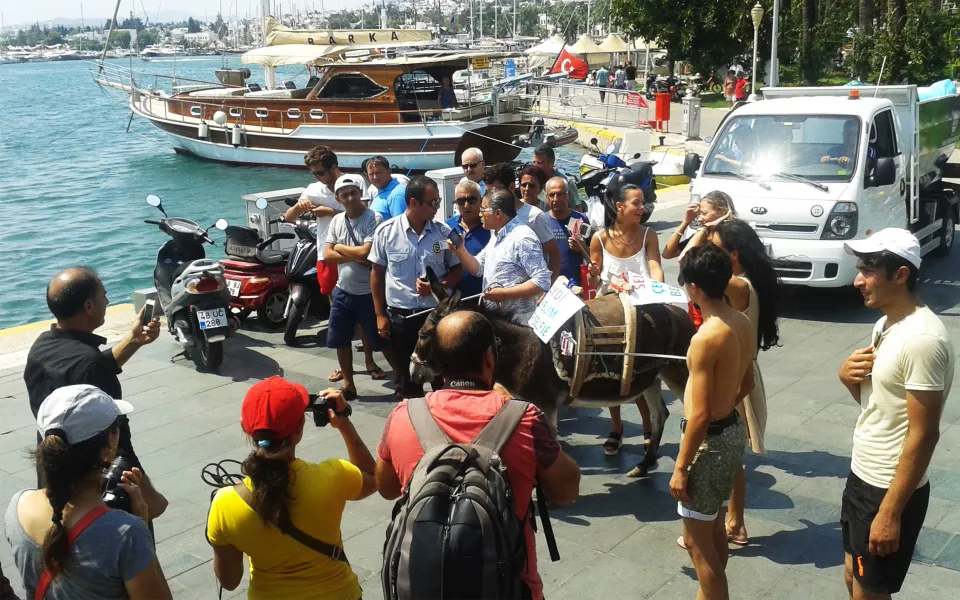 Aydın Aydın, seyyar ses sisteminden yayınlanan türküsü eşliğinde, bir eşek ve beraberinde mankenlerle Bodrum Belediye Meydanı'nda yürüyüp özçekim yaptı. Semerine "Haydi çekelim bir selfie" ve "selfie çekmek beleştir" yazılı döviz asılı eşekle dolaşan Aydın'a, hayvanseverler tepki gösterdi. Denizde tur attırmak için eşeği bir tekneye bindirmeye çalışan ancak başarılı olamayan türkücü, tepkiler artınca geldiği yöne doğru gitmeye başladı. Vatandaşlar bu sırada özçekim yapmaya devam etti.