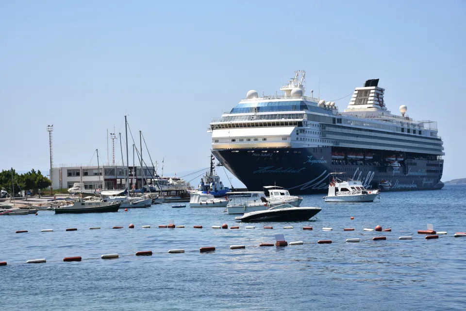 Yunanistan'ın Mikonos Adası'ndan gelen, çoğunluğu Alman 2 bin 160 yolcu ile 809 personel bulunan geminin, bu sezon ilçeye sekizinci seferini yaptığı belirtildi.