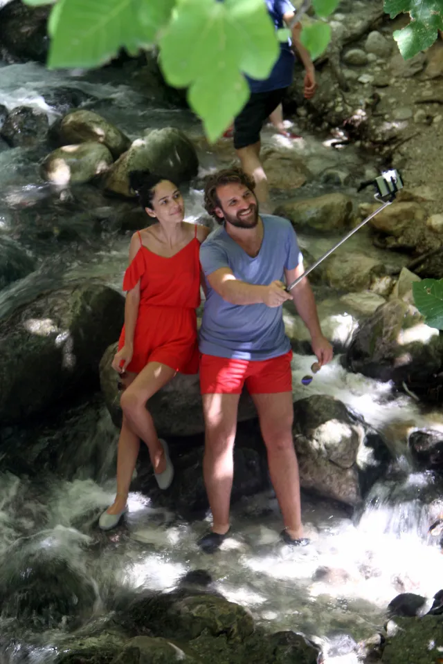 Akıntının fazla olduğu yerlere konulan halat yardımıyla kanyona giren tatilciler, dar ve yüksek kayalıklar arasında ilerlemeye çalıştı. Bazı tatilciler kanyon içinde bulunan çamuru vücutlarına sürdü.