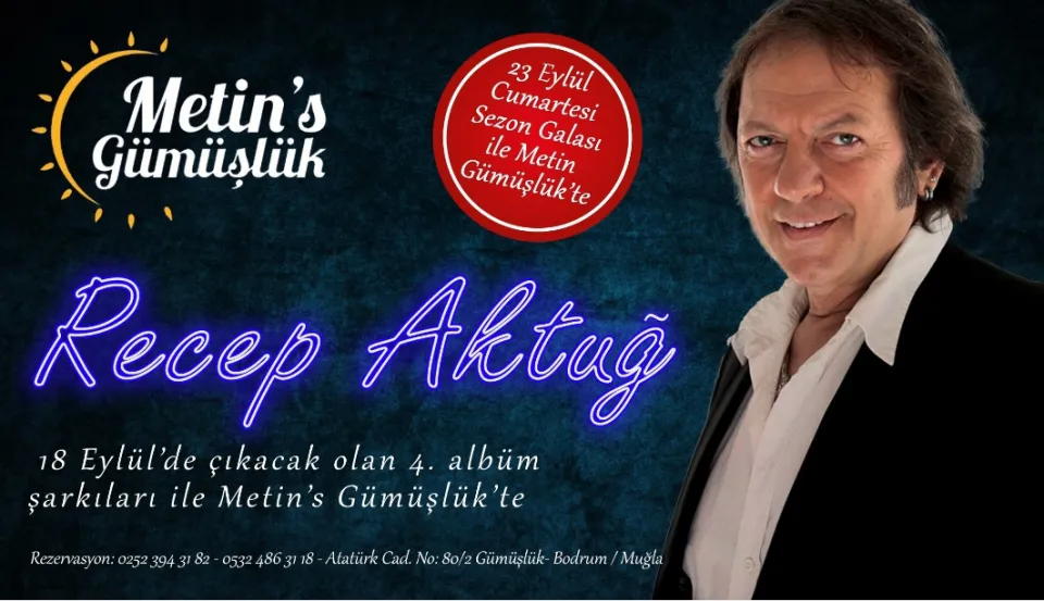 Bodrum yarımadasının en güzel yeri Gümüşlük’te 700 kişilik misafir ağırlama alanı ile hizmet veren Metin’s Gümüşlük Sezon Galasına 23 Eylül Cumartesi akşamı, sanat camiasının önemli isimlerinden biri olan Recep Aktuğ ile imza atıyor.